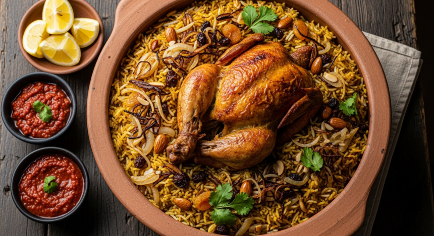 Plate the chicken mandi on a large platter, draping slices of tender chicken atop fluffy saffron rice. Garnish generously with toasted slivered almonds and fresh cilantro sprigs to add crunch and bursting freshness. Serve alongside a cool cucumber and tomato salad dressed with lemon and sumac, and a side of homemade yogurt sauce to balance the spices with creamy tang. For a final flourish, provide wedges of fresh lemon for squeezing just before eating, enhancing the mandis’ vibrant layers of flavor.